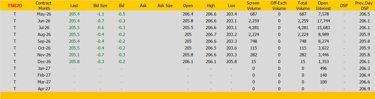 ราคายางTSR20 ตลาดยางSICOM ราคาส่งมอบเดือน พ.ค.ปิดที่205.4 เซนต์สหรัฐ  ราคาลดลง -1.1 เซนต์สหรัฐหรือ คิดเป็นเปอร์เซนต์ -0.53% %