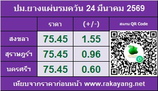 ตลาดกลางประมูลยางหาดใหญ่ (สงขลา) 75.45 บาท/กก.  ราคาเพิ่มขึ้น  https://rakayang.net/vip/view.php?idr=31402