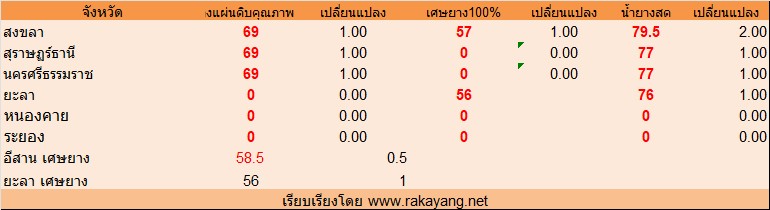 จังหวัด สงขลา ยางแผ่นดิบคุณภาพ 3  = 69บาท/กก. ราคาเพิ่มขึ้น 1.00 บาท/กก. เศษยาง 57บาท/กก. ราคาเพิ่มขึ้น 1  บาท/กก. น้ำยางสด ราคา ณ โรงงาน 79.5บาท/กก. ราคาเพิ่มขึ้น 2.00บาท