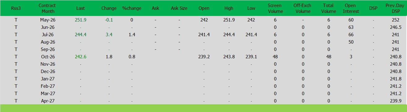 ราคาปิดตลาดยาง SICOMประจำวัน พฤหัสฯ ที่ 9เมษายน2569ราคายาง RSS3 ราคาเดือนพ.ค. ราคาลดลง -0.1เซนต์สหรัฐ ปิดที่ 251.9 เซนต์สหรัฐ