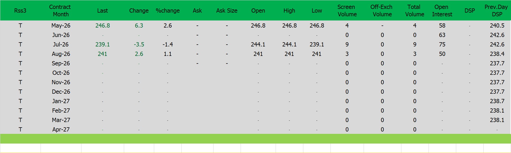 ราคายางRSS3 ตลาดยางSICOM ราคาส่งมอบเดือน เม.ย.ปิดที่246.8 เซนต์สหรัฐ  ราคาเพิ่มขึ้น 6.3 เซนต์สหรัฐหรือ คิดเป็นเปอร์เซนต์ +2.62% %