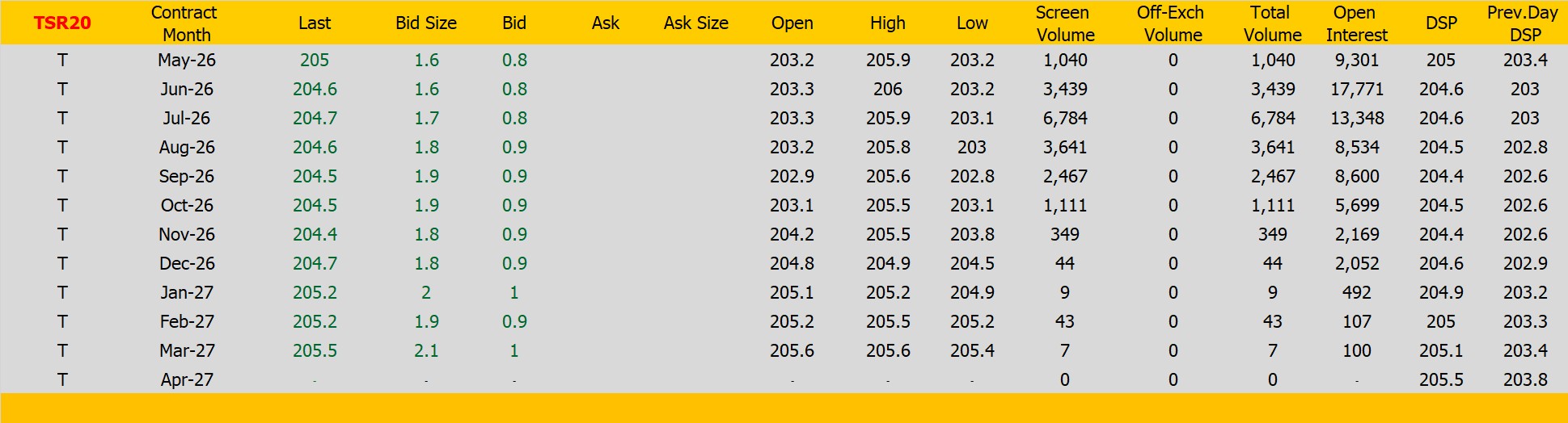 ราคายางTSR20 ตลาดยางSICOM ราคาส่งมอบเดือน พ.ค.ปิดที่205 เซนต์สหรัฐ ราคาเพิ่มขึ้น 1.6 เซนต์สหรัฐหรือ คิดเป็นเปอร์เซนต์ +0.79% %